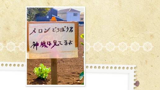 昨年の夏、道路と畑の境目に1本のプラカードが出現した。看板部分には「メロンどろぼう君、神様は見てるよ」と太いマジックの文字で書かれている。冬を過ぎた今も看板は立ったまま。きっと、犯人はまだ捕まっていないのだと思う。